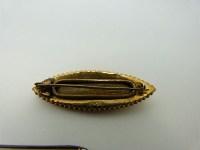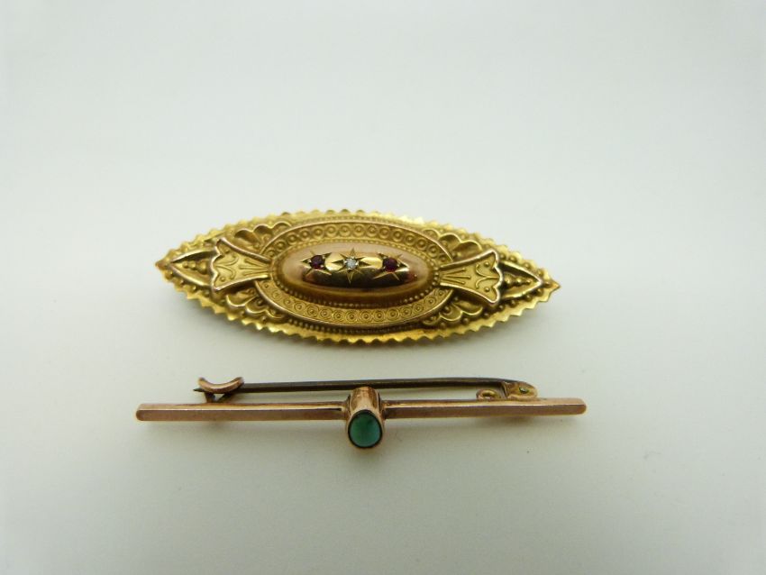 A late 19th/ early 20thC 9ct gold brooch set with a diamond and two garnets verso a glass compartment set with hair (4.5 x 1.6cm) and a 9ct gold bar brooch set with a turquoise cabochon (4.4cm)
