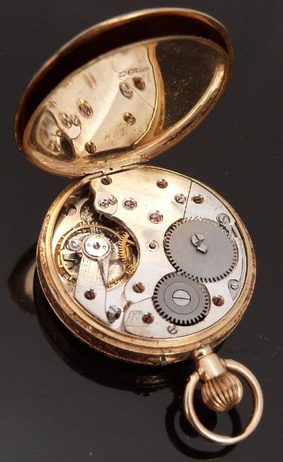 15ct gold ladies keyless winding open faced pocket watch with Roman numerals, engraved self coloured face and blued hands, case diameter 32mm, 28.7g.