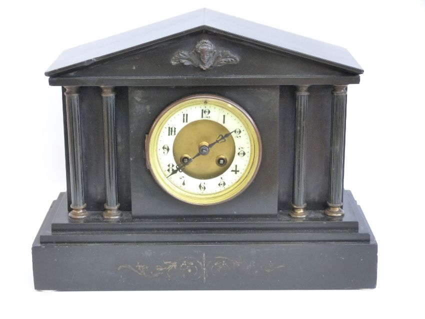 Japy Freres late 19thC slate mantel clock, ivory coloured Arabic enamelled chapter ring, beetle hands, gilt bezel, the two train movement striking on a gong, in classical architectural columned case with mask decoration, 28cm tall