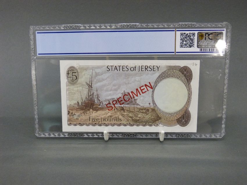 Jersey 1976-83 £5 specimen P12as gold shield grading, 64 choice unc