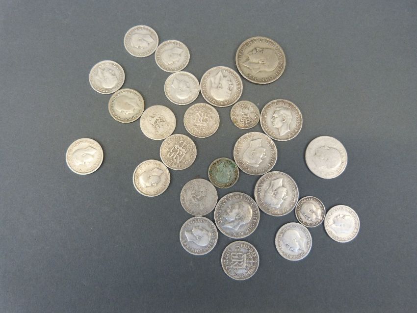 A small cache of overseas coinage, together with 89g of pre 1947 UK silver coins in a wooden box with mosaic lid