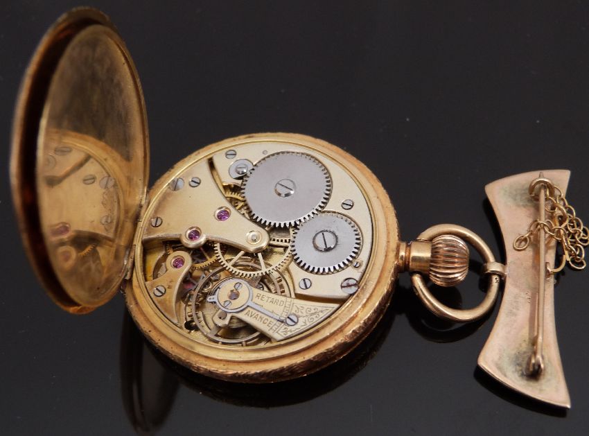 Tavannes Watch Co 18ct gold ladies pocket watch subsidiary seconds dial, blued hands, Roman numerals and gilt highlighting to the white enamel face, on 18ct gold bow bar brooch, case diameter 33mm, 30.2g.
