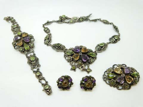 A suite of silver Arts & Crafts suffragette jewellery by Zoltan White & Company set with purple, orange and green paste in floral and foliate designs comprising bracelet, necklace, brooch and earrings all marked made in England