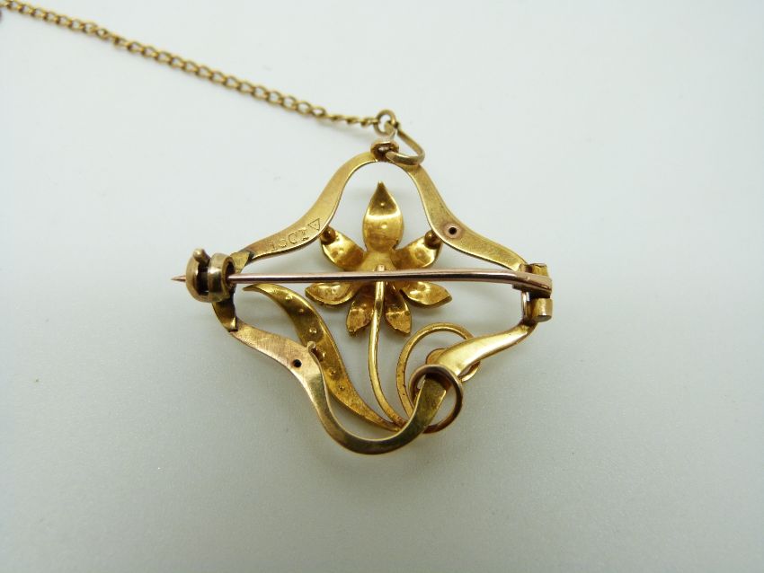 A 15ct gold Edwardian brooch set with seed pearls in a floral Art Nouveau design, 2.5cm