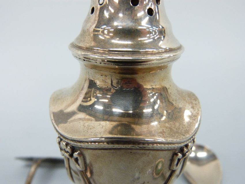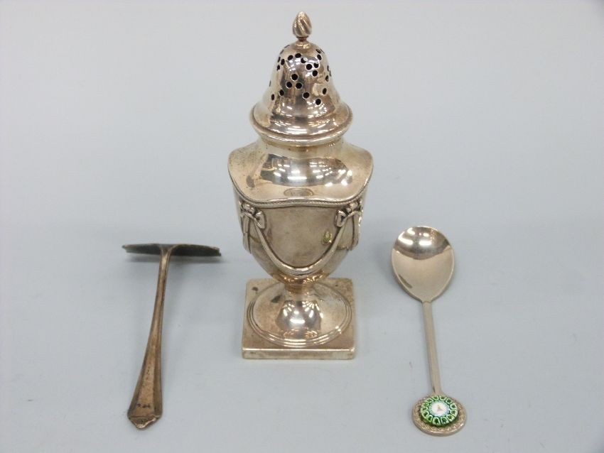A hallmarked silver pepper or small sugar caster with neoclassical swag decoration, height 13cm, a hallmarked silver pusher, weight 116g and a Caithness plated spoon