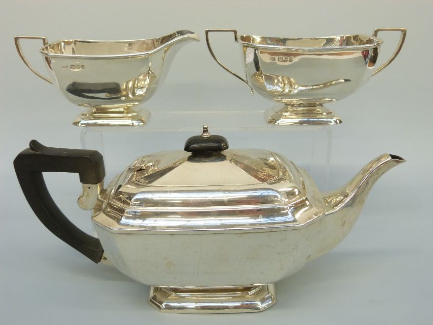 An Art Deco George VI hallmarked silver three piece tea set, London 1938, maker Kemp Brothers, length of teapot 30cm, weight 1150g all in