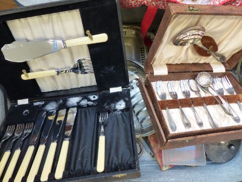 A large quantity of silver plated ware including tankard, salts, tazza, cutlery, cased gentleman's travelling set etc