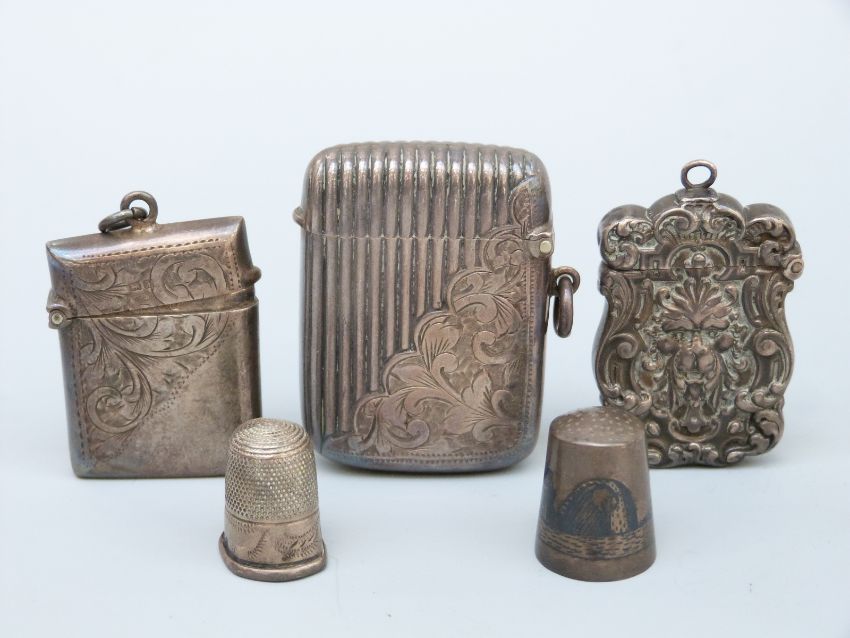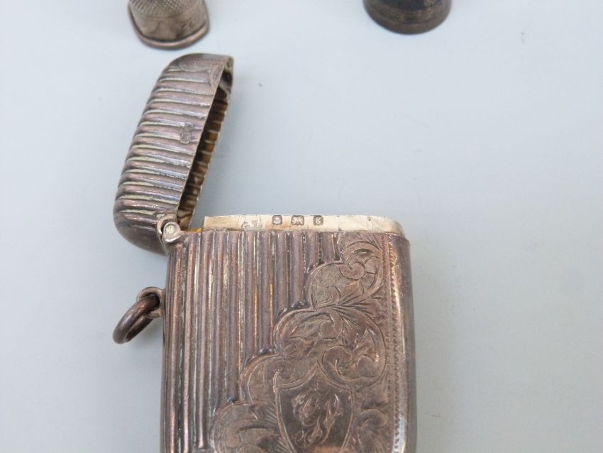 Two hallmarked silver vesta cases, a white metal vesta and two thimbles, one hallmarked silver, the other unmarked Niello