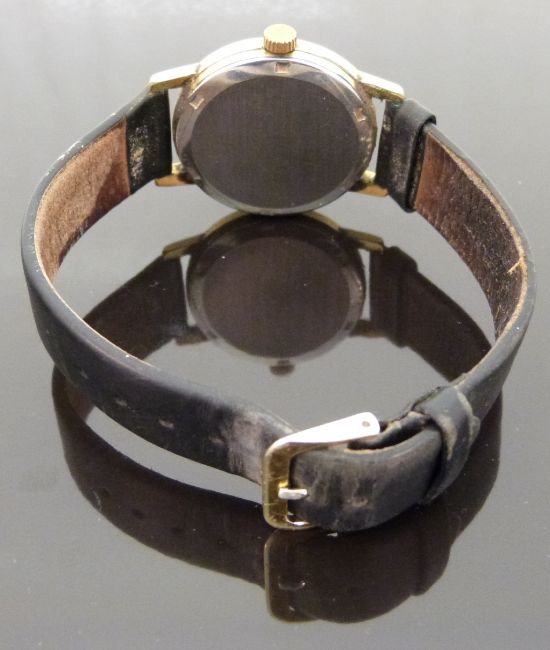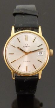Omega gold plated gentleman's wristwatch with date aperture, two tone hands and baton markers and silvered face, on black strap, case diameter 35mm