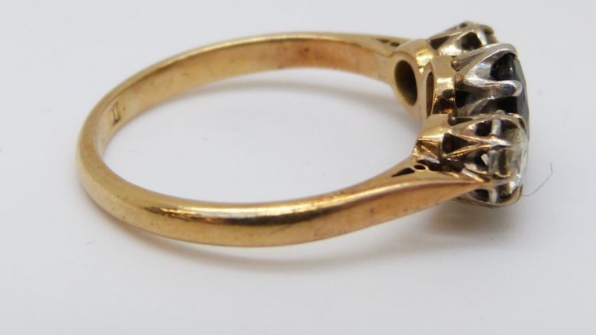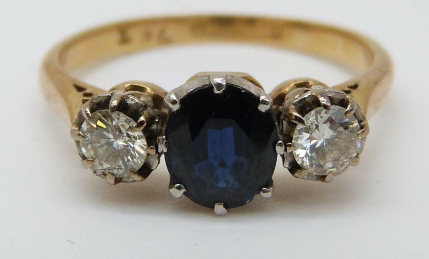 An 18ct gold ring set with a sapphire of approximately 0.63ct and two diamonds totalling approximately 0.3ct (size J)
