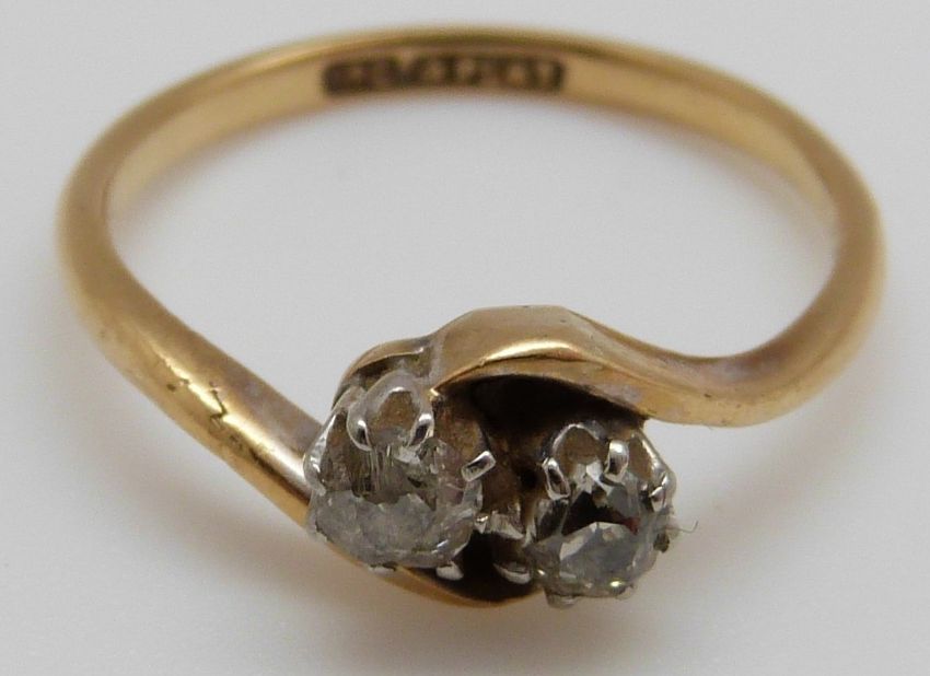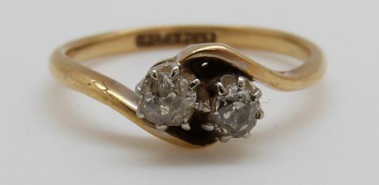 An 18ct gold ring set with two diamonds in a twist setting, 3g (size O)
