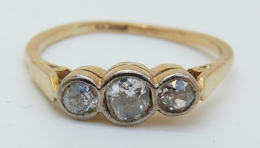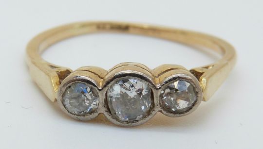 An 18ct gold Victorian ring set with three old cut diamonds (size M)