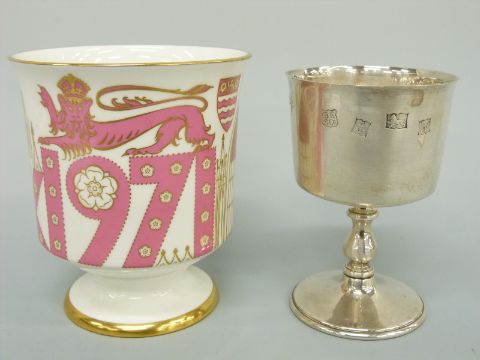 A commemorative feature hallmarked silver goblet and matching china goblet for York centenary, height 11cm, weight 148g