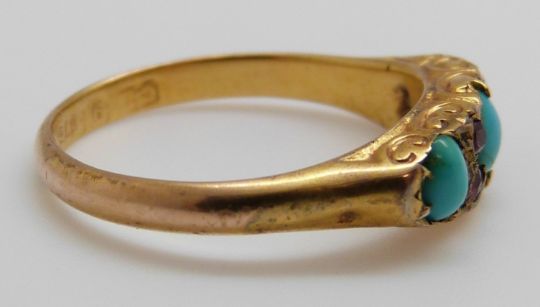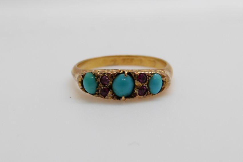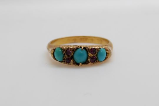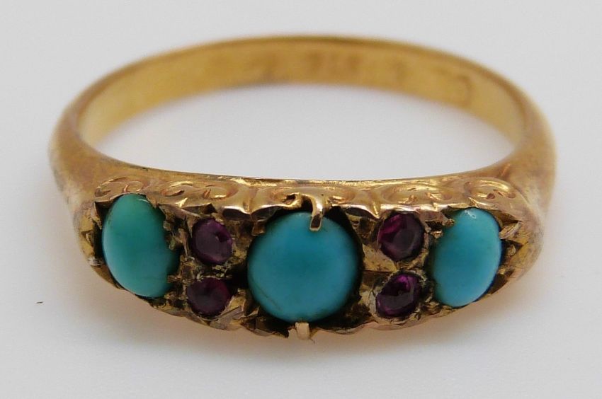 A hallmarked 9ct gold ring set with three turquoise cabochon and four rubies Birmingham 1910 (size M)