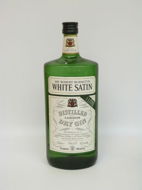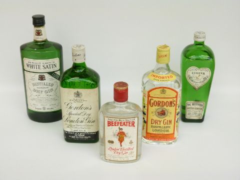 Four bottles of gin including Sir Robert Burnetts White Satin 1 litre 37.5% vol, two 75cl bottles of Gordon's gin one 47.3% vol the other 40% vol, a 375ml bottle of Beefeater gin and a 75cl bottle of John de Kuyper and Son Dutch Geneva