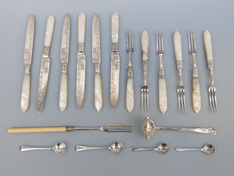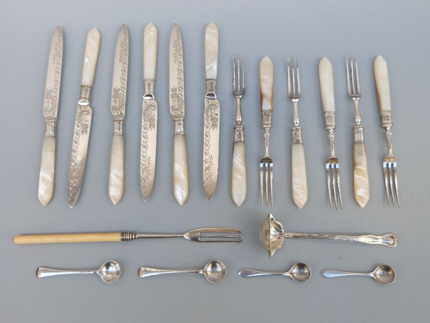 A set of six cake knives and forks with hallmarked silver ferrules, two pairs of hallmarked silver mustard spoons, Victorian hallmarked silver pickle fork and a Tiffany style brandy ladle marked sterling