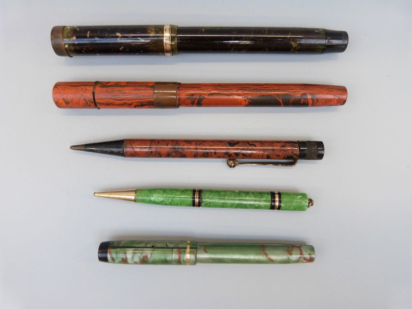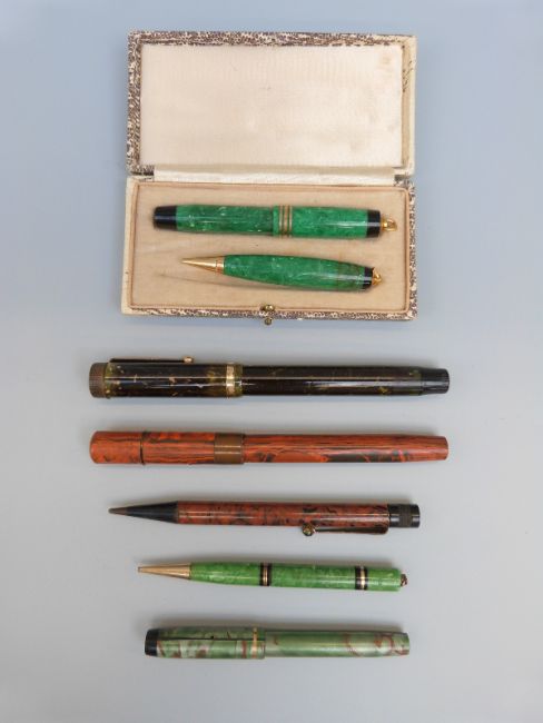 Seven vintage pens and pencils including George Parker green marbled pair, Altura 702 in orange marble, George S. Parker, Conway Stewart Dinkie no 540 etc