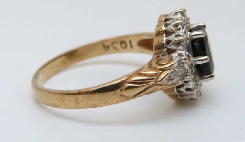 A 9ct gold ring set with an oval sapphire surrounded by diamonds (size M)