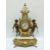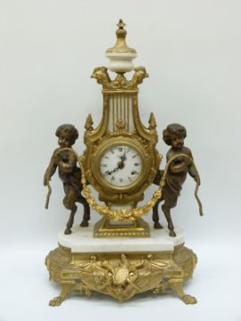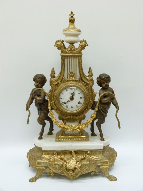 An ormolu and marble French style clock garniture, the German movement striking on a gong, the case flanked by hoofed putti, 60cm tall