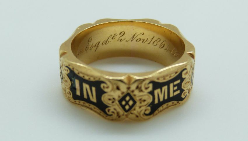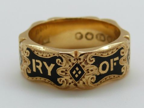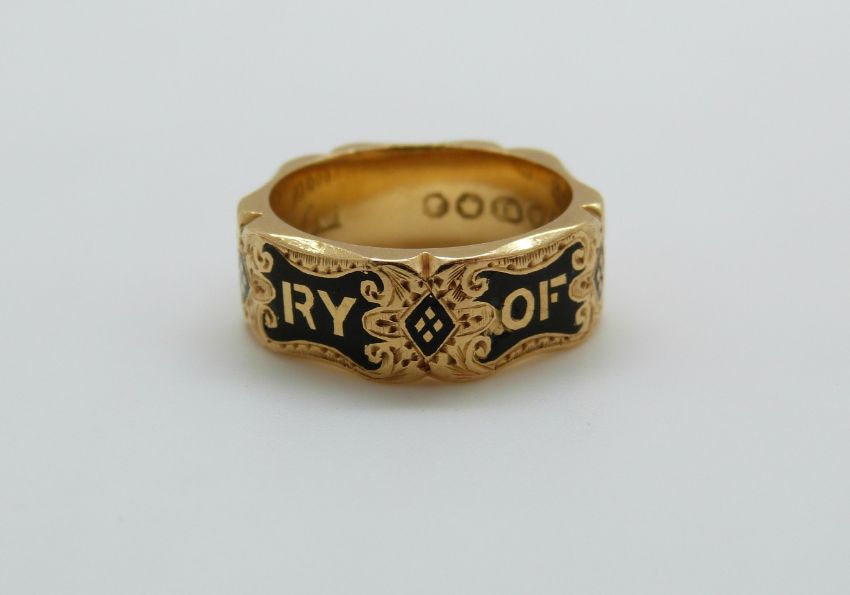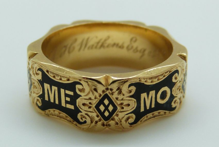 A hallmarked 18ct gold mourning ring, London 1864, set with black enamel reading 'In memory of' and to inner band 'W.H.Watkins.Esq Ob 2nd November 1864 at 46', 5.5g, size L/M