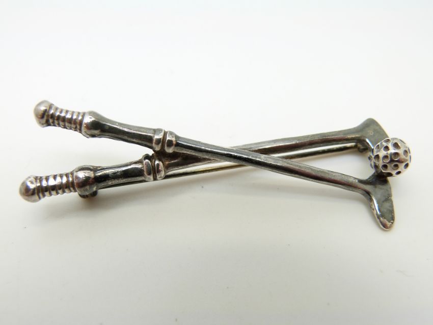 A silver brooch in the form of two golf clubs and ball