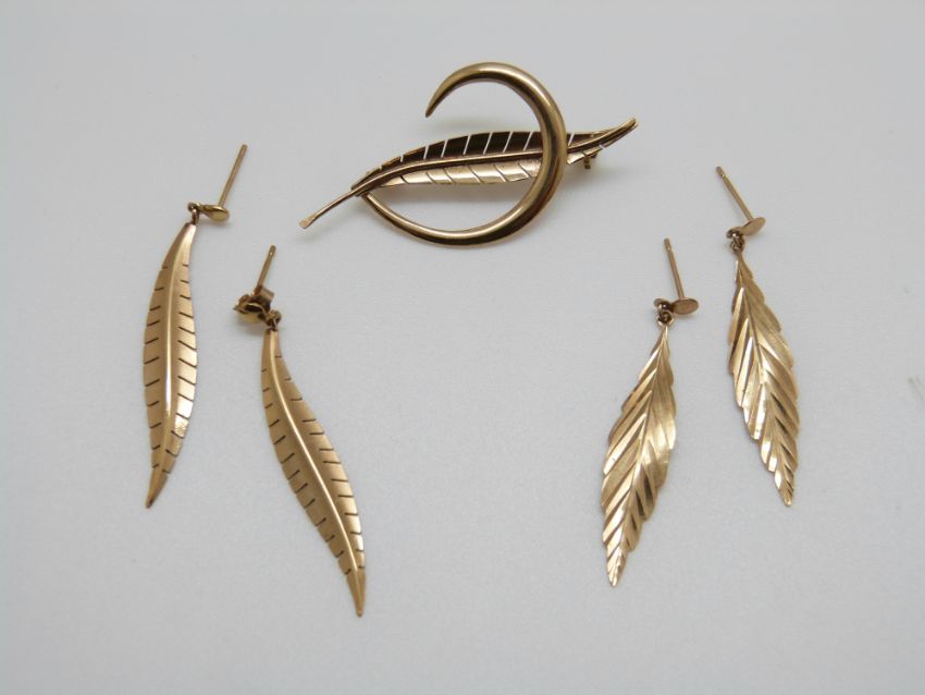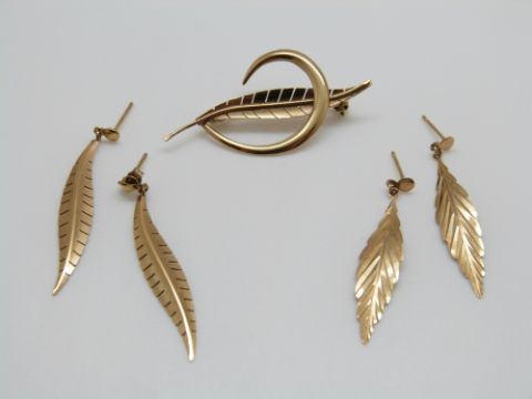 A 9ct gold leaf brooch and two pairs of 9ct gold earrings, 3.7g
