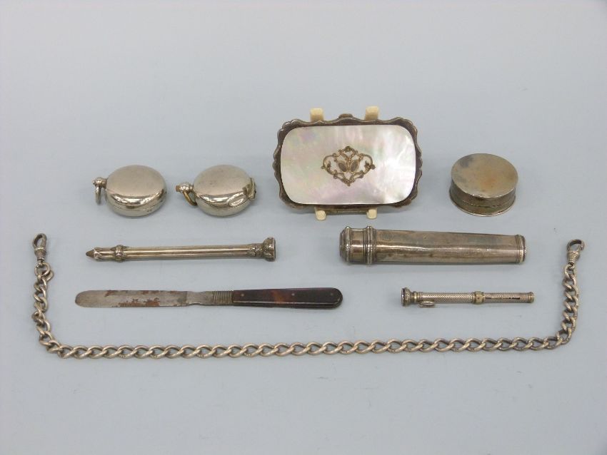 A mother of pearl purse, Victorian hallmarked silver pot, Mordan & Co pencil, a white metal pencil, a hallmarked silver Albert, sovereign cases etc
