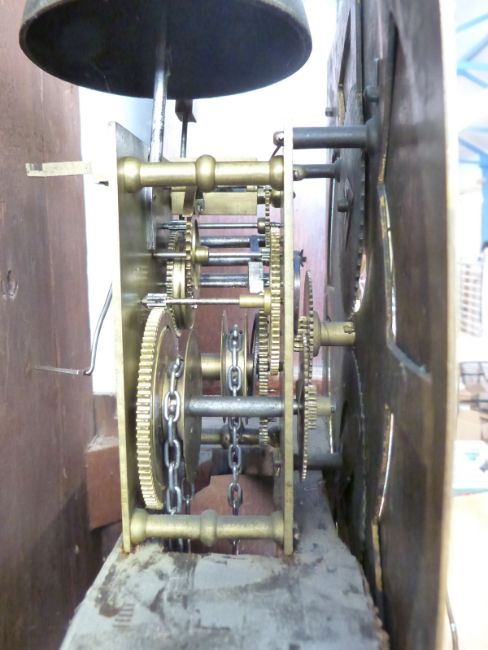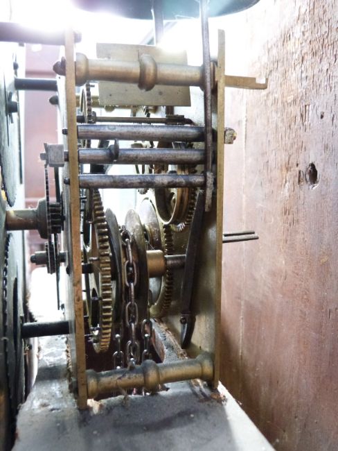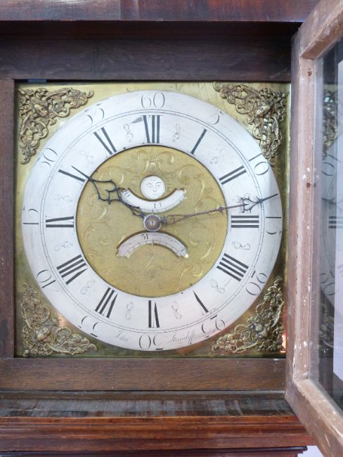John Standcliffe, Barkisland (1706 - 1780) mid 18thC oak and mahogany longcased clock with 8 day duration movement, the 12inch Roman brass dial with Arabic minutes on silvered chapter ring, spandrels of cherubs design to the corners. The 30 hour movement with date crescent and penny moon, four pillar mechanism striking on a bell. The moon with brass thistle finial, and classic columns with brass capitols, 205cm tall
