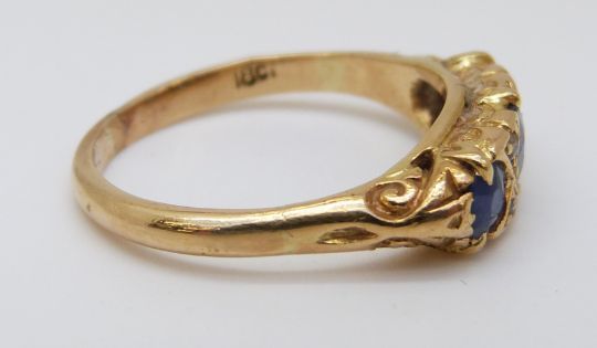 An 18ct gold ring set with three sapphires and four diamonds (size M)