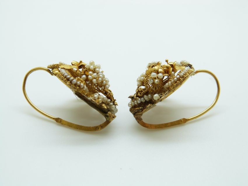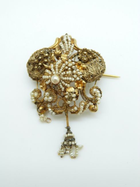 A French filigree gilt floral and foliate brooch set with seed pearls, with matching earrings, maker L.F