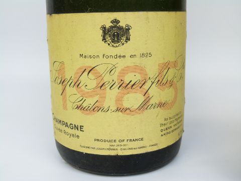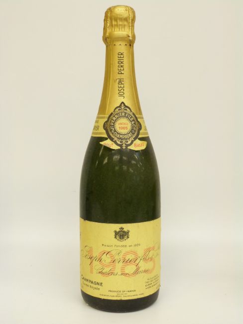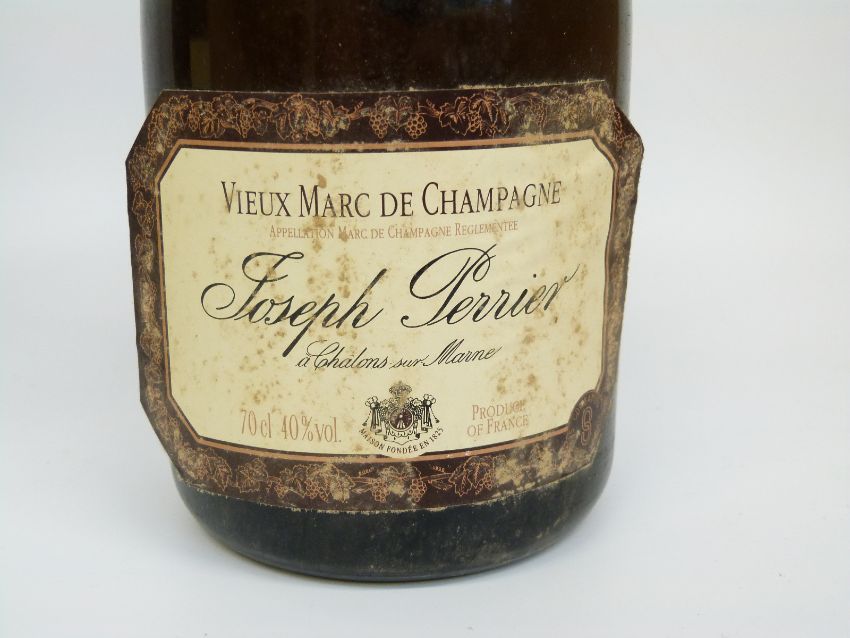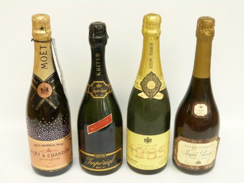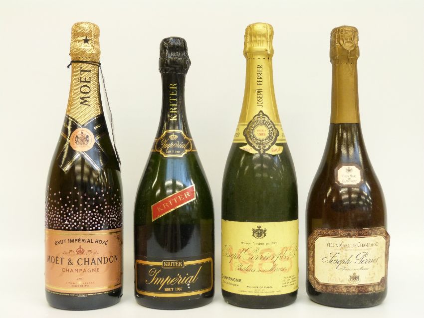 Three bottles of champagne comprising Joseph Perrier fils & Co Cuvée Royale 1985 750ml 12% vol, Moet & Chandon rosé champagne 750ml 12% vol, Kriter Imperial Brut 750ml 11.5% vol and Jospeh Perrier Vieux Marc de Champagne 70cl, 40% vol