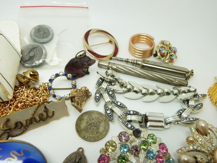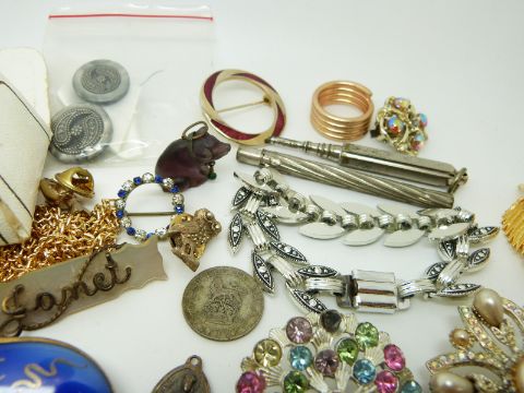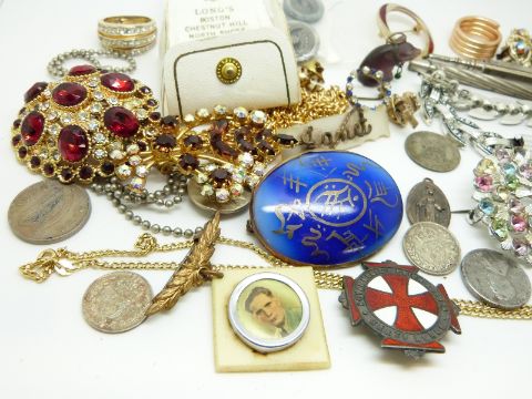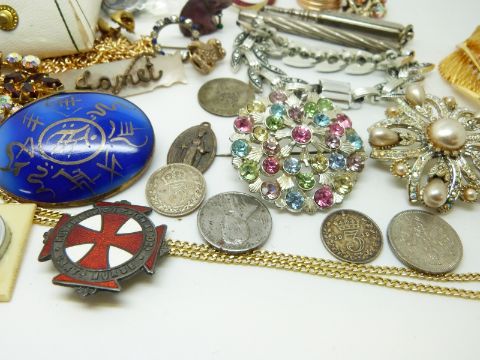 A 9ct gold necklace, bear charm, silver nursing brooch, white metal St Christopher, brooches, coins etc