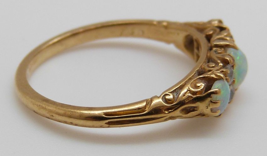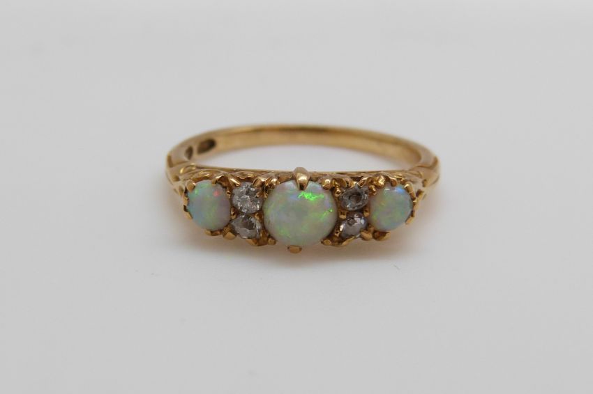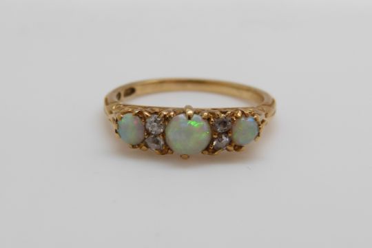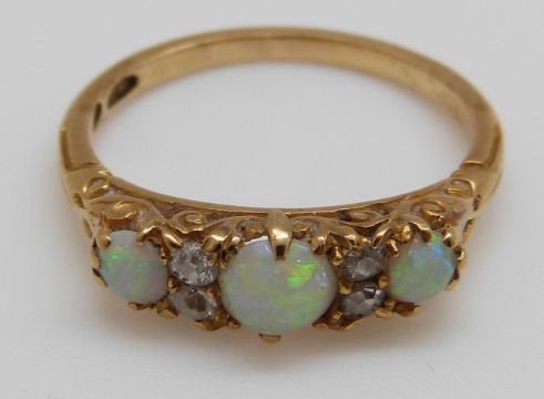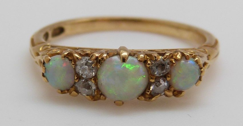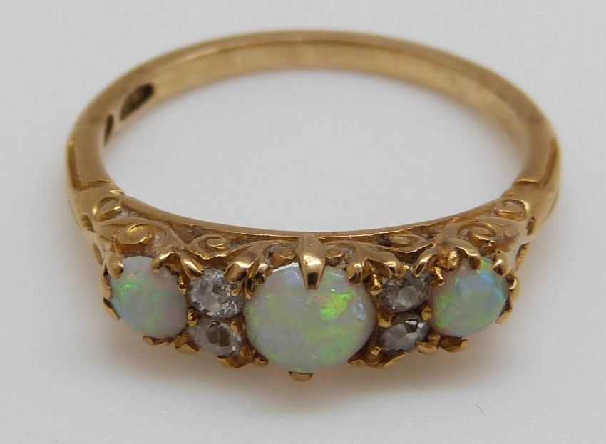 An 18ct gold ring set with three opal cabochons and four old cut diamonds (size N)