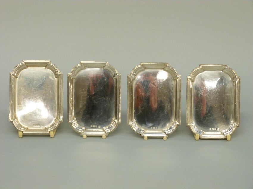 A set of four George V hallmarked silver pin dishes with shaped corners, Birmingham 1927 maker Goldsmiths and Silversmiths Co., length 10cm, weight 161g