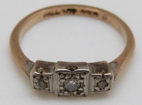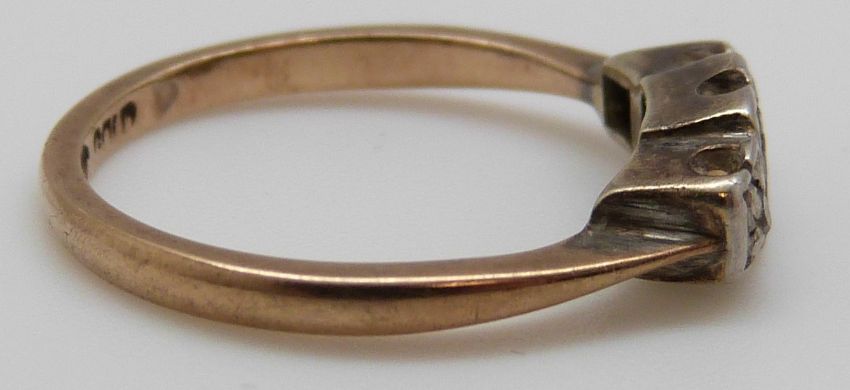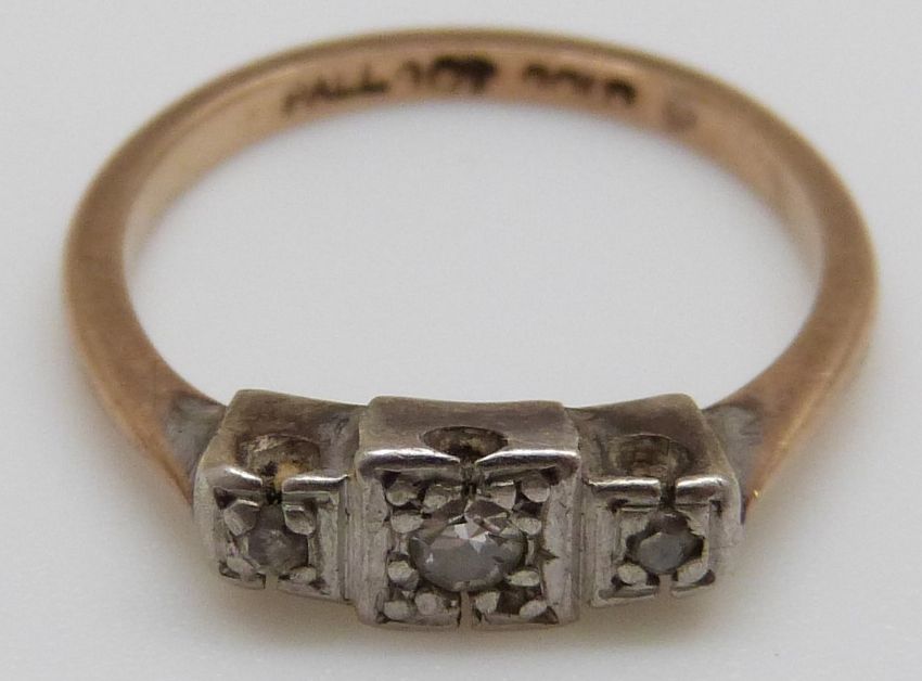 A 9ct gold ring set with three diamonds in a palladium setting, 1.9g (size J)