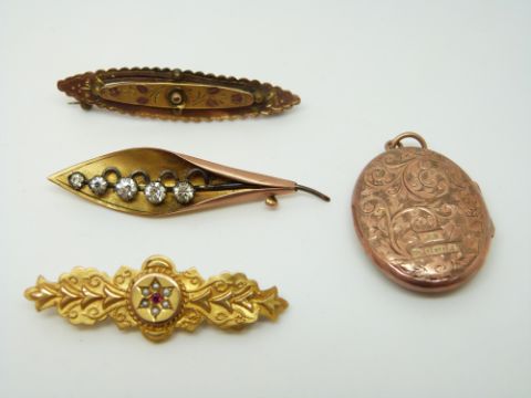 Two 9ct gold brooches one set with seed pearls, a 9ct gold locket (6.8g) and another brooch