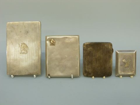 Four hallmarked silver cigarette cases including two slide to open examples with gold animals to front, both made by S P Ora & Co and two Mappin & Webb examples, weight 475g