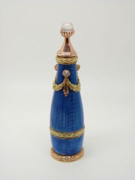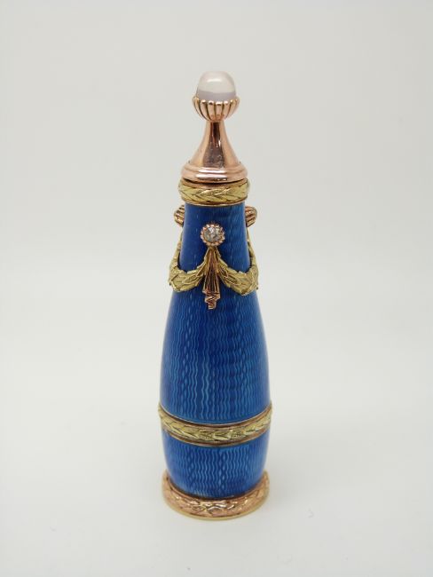 A guilloche enamel scent or perfume bottle with gold mounts set with old cut diamonds and a moonstone cabochon finial bearing impressed Faberge and Russian gold standard marks to base, 6.3cm tall, 22.9g