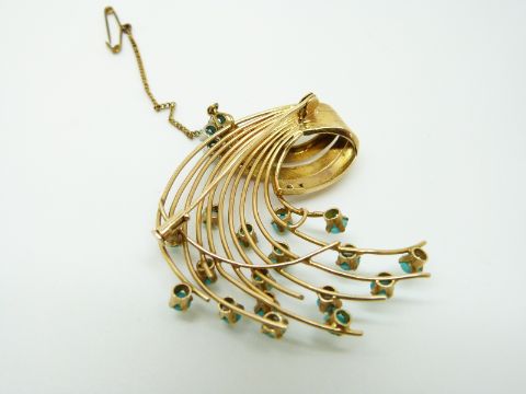 A Persian yellow metal brooch set with turquoise cabochons and diamonds, 4.4cm