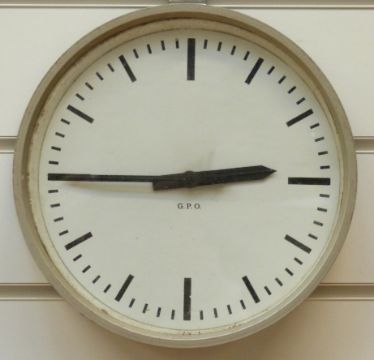 A c1970 G.P.O wall clock, the white dial with baton numerals, 22.5cm diameter, with Gent of Leicester electric movement. 630817 74B OAA 72/MK1 to rear