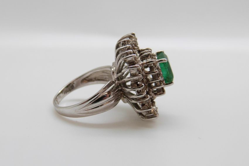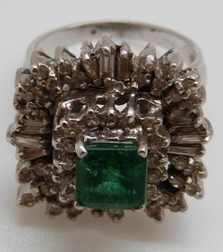 An 18ct white gold ring set with a square cut emerald of approximately 1ct surrounded by baguette and round cut diamonds (size L)