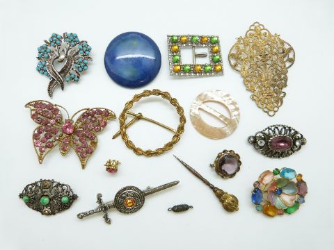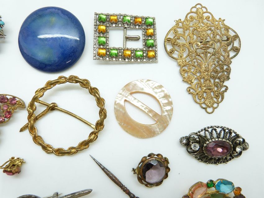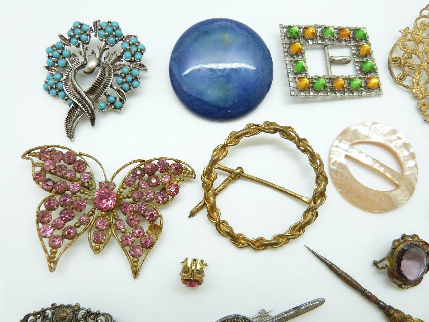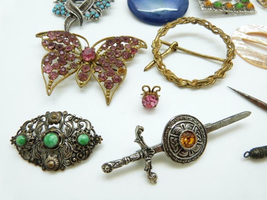 A collection of costume jewellery brooches including a butterfly, buckles etc