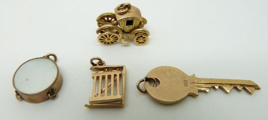 Four 9ct gold charms, key, drum, gate and a coronation coach, 7.9g