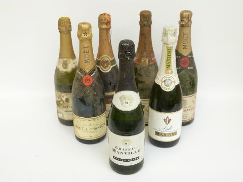 Seven bottles of champagne and sparkling wine comprising Moet & Chandon 1966 dry Imperial, Moet & Chandon Brut Imperial, Chateau Marville sparkling perry, Laurent Perrier champagne, Asti Martini, Moscato Spumante and Furstenstein