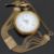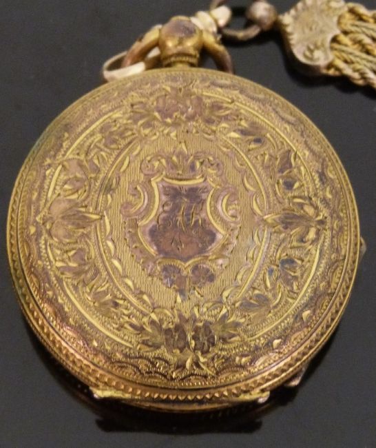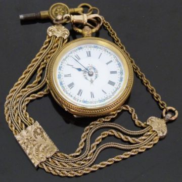 Silver gilt ladies pocket watch with Roman numerals and floral decoration to the white enamel dial, on matching chain, case diameter 38mm.