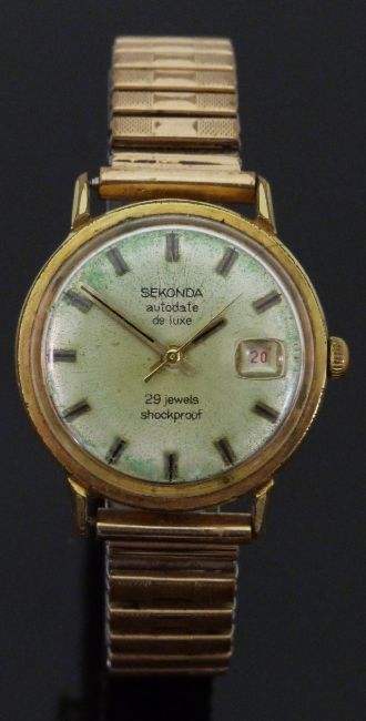 Sekonda Autodate De Luxe gold plated gentleman's wristwatch with date aperture, two tone hands, baton markers and silvered face, on expanding metal bracelet, case diameter 34mm.