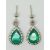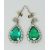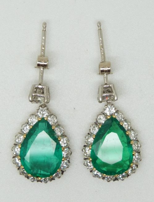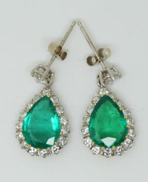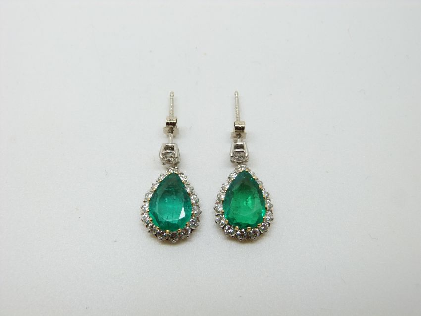 A pair of 18ct gold earrings set with a pear cut apple green emerald to each measuring approx 2ct, a diamond to the top (each measuring approx 0.2ct) with further diamonds around the emeralds