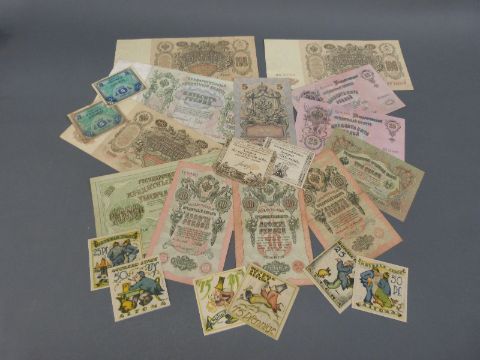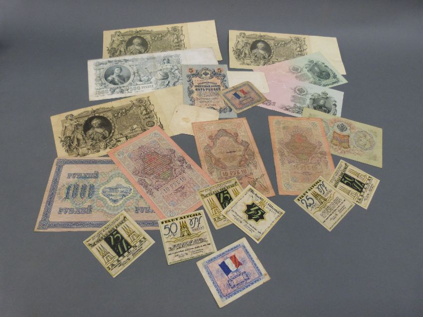 France Assignat de 50 sols 1792 signature Saussay, together with a 10 sous example 1731, signature Guyon and a collection of Russian Empire examples, Notgeld etc