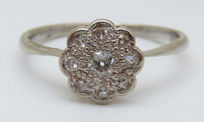 An 18ct white gold ring set with diamonds in a cluster (size R)