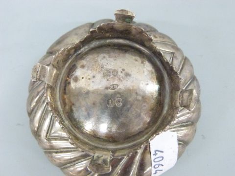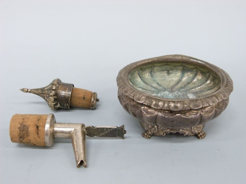A Georgian hallmarked silver open salt raised on four paw feet, London 1824 maker Charles Fox II, weight 77g, an Edward VII silver bottle stopper London 1901 maker William Hutton & Sons Ltd and a bottle pourer
